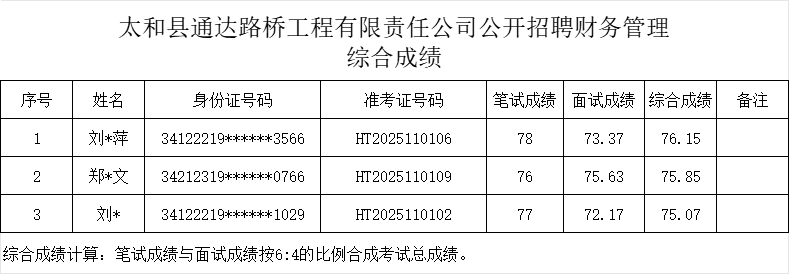 附件:太和县通达路桥工程有限责任公司公开招聘财务管理综合成绩