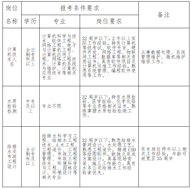 2025年12月29日太和县椿城供水有限公司发布的招聘公告,因部分岗位报名通过人数未达到规定比例,现根据工作实际需要,经研究决定取消“机电自动化操作”岗位招聘计划(详见岗位计划取消公告),并对“计算机技术人员”、“水质检验检测”、“给排水及市政工程设计”等3个岗位的招聘报考条件进行调整,具体调整事项如下: