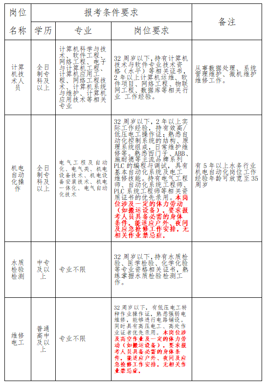 我公司于2025年12月29日、2026年1月14日、2月5日发布的招聘公告,现因计算机技术人员、水质检验检测、维修电工、机电自动化操作报名通过人数未达到规定比例,根据工作实际需要,经研究决定对上述4个岗位的招聘报考条件等其他事项进行调整,具体公告如下:
