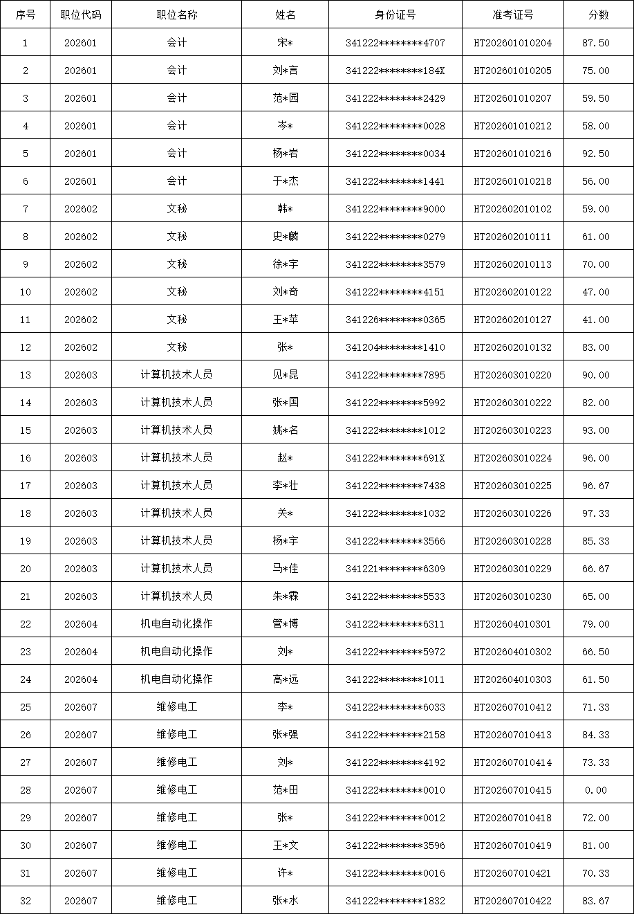 根据《太和县椿城供水有限公司公开招聘31名工作人员招聘公告》及补充公告,现将考生专业技能测试成绩予以公示,接受社会监督。